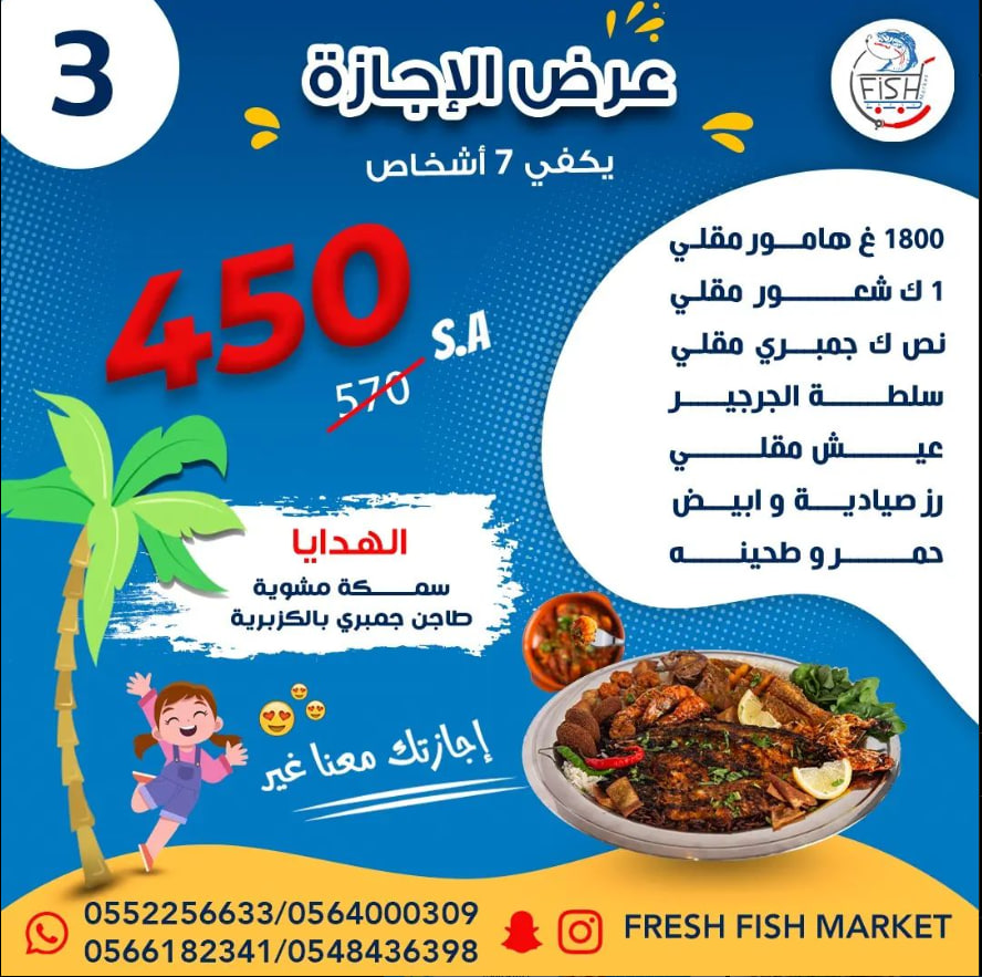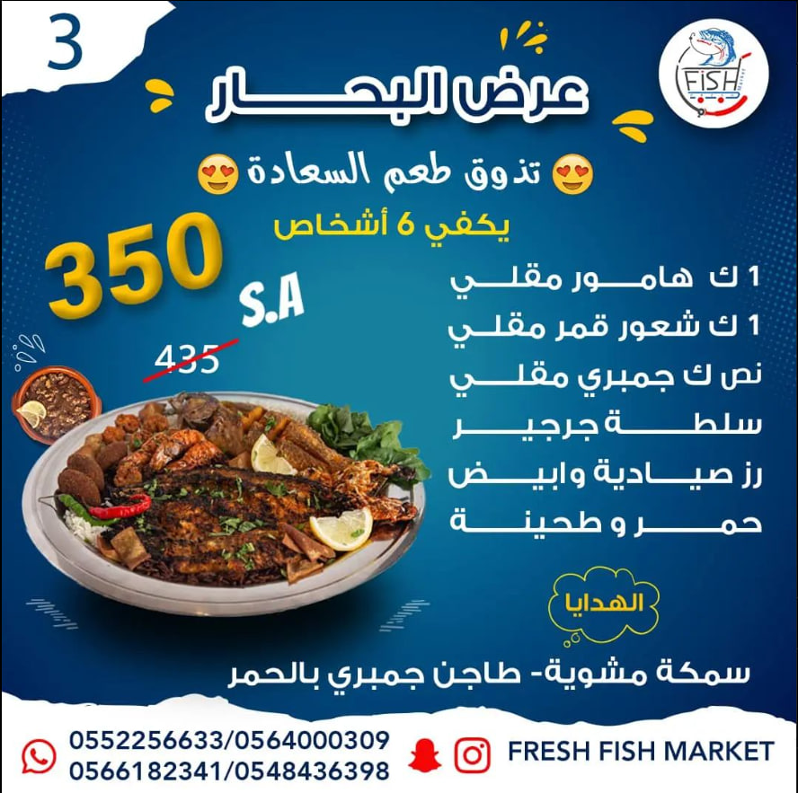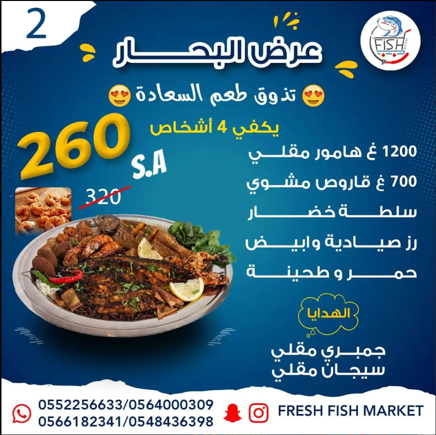مطعم سوق السمك الطازج Fresh Fish Market هو مطعم متخصص بالمأكولات والأسماك البحرية الطازجة من خلال صيادين متميزين بتوفير الاسماك الطازجة للمطعم بشكل يومي يقدم المطعم جميع انواع الاسماك والاطعمه البحريه سواء نيئه او مشويه او مقليه بما فيها المشويات المقليات الطواجن الصواني الوجبات السندويشات ضمن المطعم صاله لعرض الاسماك البحريه الطازجه لتمكين العميل من اختيار الاسماك التي يريدها بنفسه يضم المطعم قسم مخصص للعوائل ومتوفر فيه بارتشنات كما يوجد قسم خاص بالشباب المطعم على استعداد لتلبيه طلبات الحفلات والمناسبات الاجتماعيه وتقديم الاطعمه بشكل لائق ضمن صواني وصحون مخصصه للمناسبات يقدم المطعم عروض اسبوعيه وخلال فترات الاعياد والمناسبات ستنال رضا الجميع يؤمن المطعم توصيل الطلبات لكل انحاء جده ومكه المكرمه